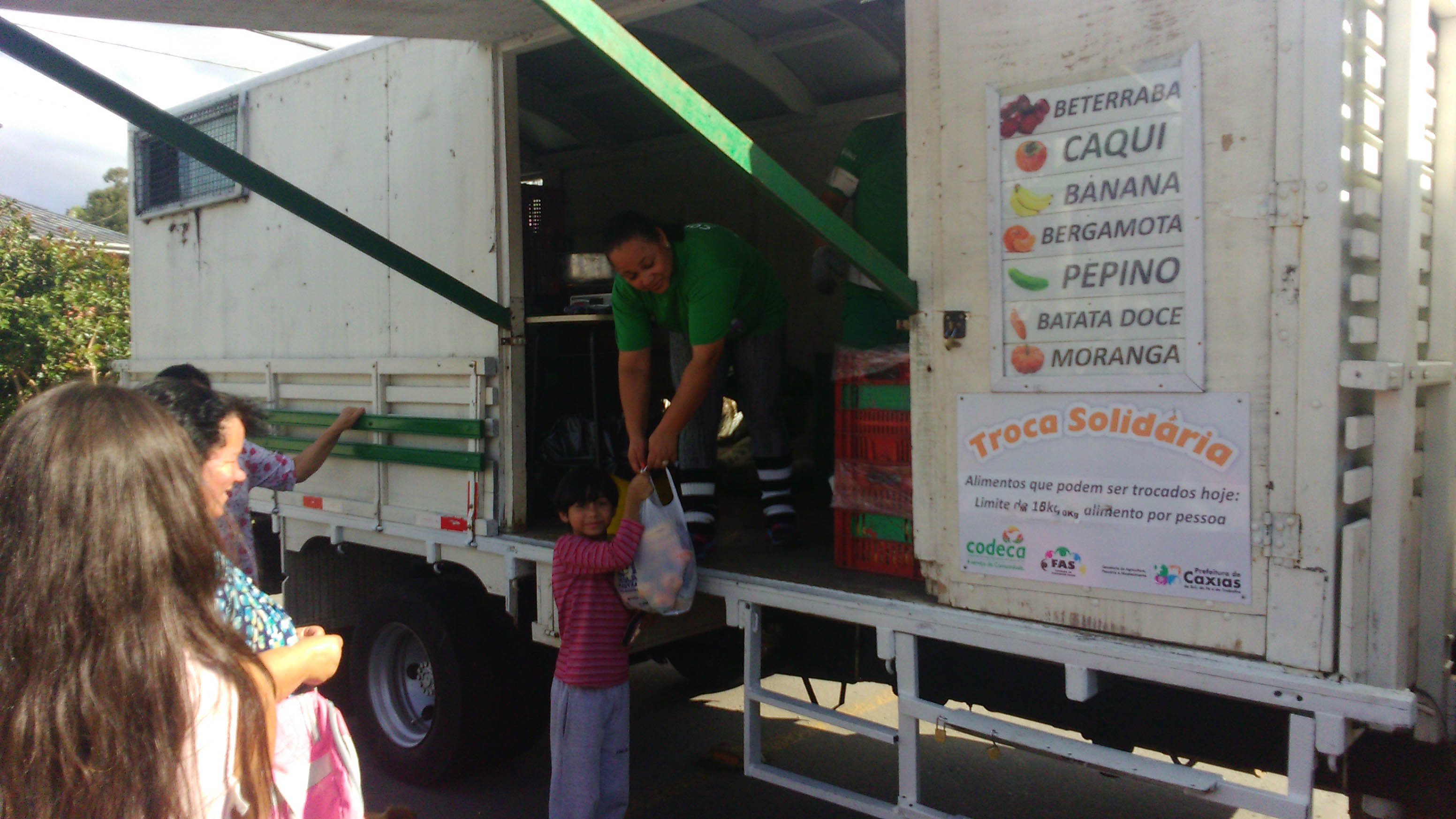 Neste sábado (28.05) ocorre o Troca Solidária. O programa troca de 4Kg de resÃduos recicláveis por 1Kg de alimento, no qual as pessoas poderão escolher entre banana, pepino, beterraba, caqui, moranga e bergamota. O programa é uma iniciativa da Prefeitura de Caxias, desenvolvida pela Companhia de Desenvolvimento (CODECA), em parceria com a Secretaria da Agricultura, Pecuária e Abastecimento (SMAPA) e a Fundação de Assistência Social (FAS).De acordo com o Diretor-Presidente da CODECA, Paulo Ballardin, a cidade teve um grande ganho com a implantação do Programa. \\\"A Administração Municipal e a CODECA colhem diariamente resultados positivos, visto que diminui o registro de problemas como a má destinação do lixo reciclável. A reeducação ambiental que a população vem adquirindo prova que projetos como esses podem interferir significativamente no desenvolvimento sustentável das grandes cidades, como a de Caxias do Sul\\\", destacou. Confira os locais:TURNO DA MANHÃ08:30 – Canyon – Rua da Felicidade08:30 – Beltrão – Rua Cristóforo Randon (lateral do posto Coocaver)10:30 – Reolon - Rua Luiz Pereira da Silva (ao lado do centro Comunitário)10:30 – Fátima Baixa – Av. Dr. Mário Lopes (Próx. Rua João Brogliato)TURNO DA TARDE13:30 – Monte Carmelo Rua Pato Branco esquina com a Rua Francisco Beltrão de Queiroz13:30 – Mariani – Rua VergÃnia Botini Reuse (em frente ao centro comunitário)15:30 – Vila Lobos – Rua Ametista esquina com a Rua E15:30 – São Gabriel – Rua Aida Esther da Rosa (ao lado do centro comunitário) Fotos: Erica Finimundi