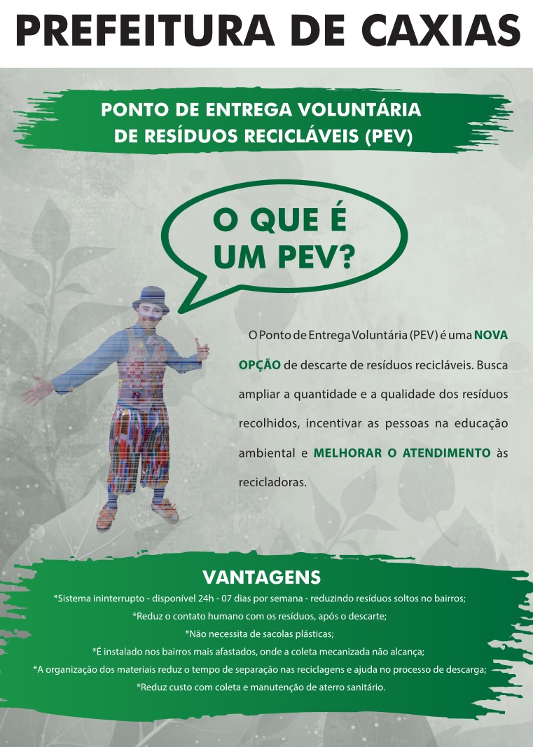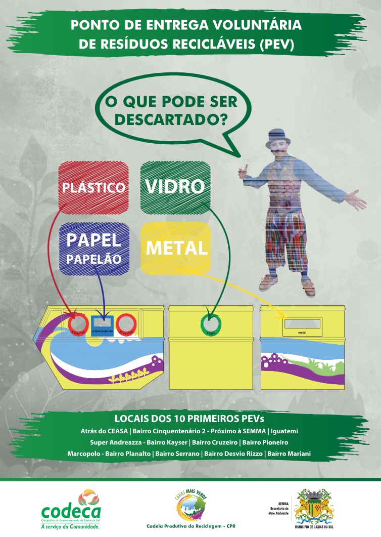 A Prefeitura de Caxias do Sul, por meio da Secretaria Municipal do Meio Ambiente (SEMMA), entrega nesta sexta-feira (21/10) o primeiro Ponto de Entrega Voluntária de Resíduo Reciclável (PEV) à comunidade. A solenidade acontece às 14h, na rua Amábile César Vial, em frente à E.M.E.F José Protázio Soares de Souza, no bairro Serrano. Os PEVs têm como objetivo criar uma nova opção de descarte de resíduo reciclável na cidade, com tecnologia própria e já existente no município e que interaja com a comunidade. No contexto do Plano Municipal de Gestão Integrada de Resíduos Sólidos de Caxias do Sul, os PEVs surgem como solução transversal que intermedia o descarte de resíduos sólidos de origem doméstica em geral. Os recicláveis por sua vez, necessitam de uma forma operacional mais dinâmica, atendendo e aproximando a população aos locais de recebimento, disponibilizando em tempo integral um sistema novo e eficiente de atendimento, captando um volume maior de resíduo reciclável diretamente na fonte, aliado ao controle operacional público que incentivará a redução dos impactos ambientais e do contato humano com os resíduos após o descarte, a sensibilização da população, o envolvimento do órgão ambiental responsável na educação ambiental da comunidade e na formação de uma nova cultura de descarte autônomo. A consequência disso é a melhoria da destinação final de resíduos recicláveis, aumento da renda de catadores e recicladores formalizados no projeto de “Geração de Emprego e Renda”, inscrito no PMGIRS, com o prolongamento da vida útil do Aterro Sanitário e melhoria no processo de Gestão Ambiental municipal. O projeto do Comitê Municipal da Cadeia Produtiva da Reciclagem (CPR), coordenado pela SEMMA, vai instalar 10 PEVs em bairros definidos, como locais de entrega voluntária. O projeto é executado em parceria com a CODECA e a CTS Comércio de Aparas, servindo para atender especificamente aos bairros. A experiência da coleta será da CODECA, que receberá os roteiros pré-estabelecidos pela SEMMA. Os PEVs são caixas estacionárias metálicas (tipo poliguindaste), de oito metros cúbicos, com recolhimento mecanizado, didaticamente projetada, de forma a interagir com a comunidade. Com seu desenho alegre e didático, visa contribuir com o ambiente no qual ele está instalado e com a educação ambiental no bairro. Os benefícios são dos PEVS - Disponível 24h por dia e sete dias da semana para o descarte na comunidade - Não confronta com os horários de trânsito mais apurados - Reduz o contato humano e dos animais aos resíduos - Melhora a aparência do ambiente onde será instalado - Não será possível a prática de catação nesse local, pois o contêiner somente abre nas reciclagens - Haverá monitoramento periódico da fiscalização da CODECA para que os locais estejam sempre limpos e organizados - A SEMMA, periodicamente, adotará canteiros de flores no local, para chamar à atenção da população local para as questões ambientais - Possibilidade de desencadear o processo de educação ambiental de forma que promova a melhoria no atendimento da coleta seletiva nos bairros e aumente o volume de recicláveis recolhidos na cidade. O projeto PEV de Resíduos Recicláveis está fracionado em etapas, justamente para organizar o seu processo de implantação. Serão cinco etapas, iniciando em 10 bairros pilotos da cidade, estrategicamente escolhidos, não confrontando com a área mecanizada. Etapa 1 – Implantação dos locais e divulgação Etapa 2 – Mudança da cultura de descarte nos locais escolhidos Etapa 3 – Ampliação para a implantação nas atividades escolares e atividades comerciais Etapa 4 – Criação de novo tema com a participação das grandes geradoras de resíduos, de acordo com o PMGIRS Etapa 5 – Ampliação do sistema para outras 10 áreas A campanha de divulgação inicia na próxima semana e a instalação será gradativa. Serão quatro bairros inicialmente, a partir desta sexta-feira (Serrano, Mariani, Kayser e Planalto), sendo outros quatro bairros nos próximos 15 dias.