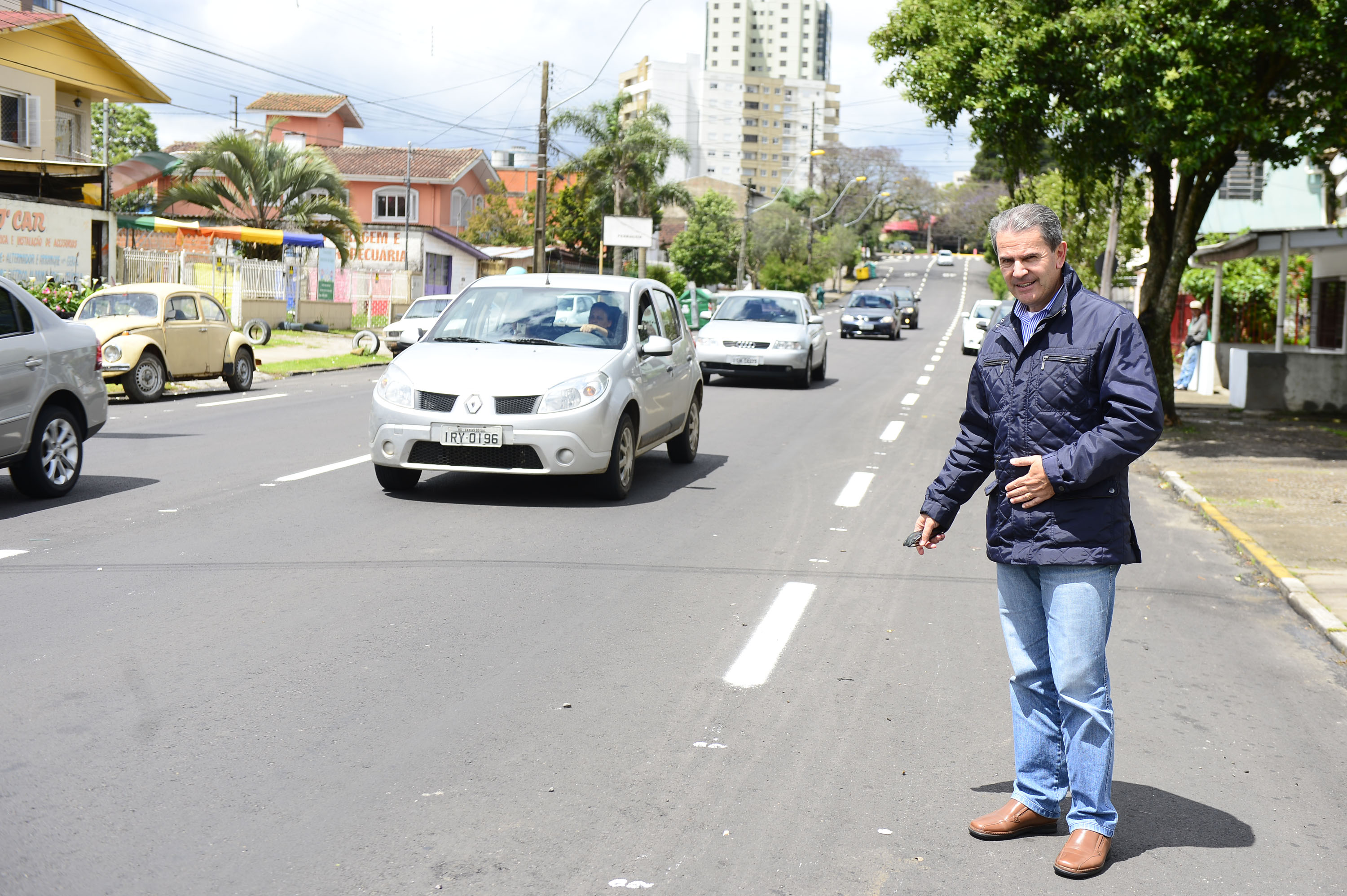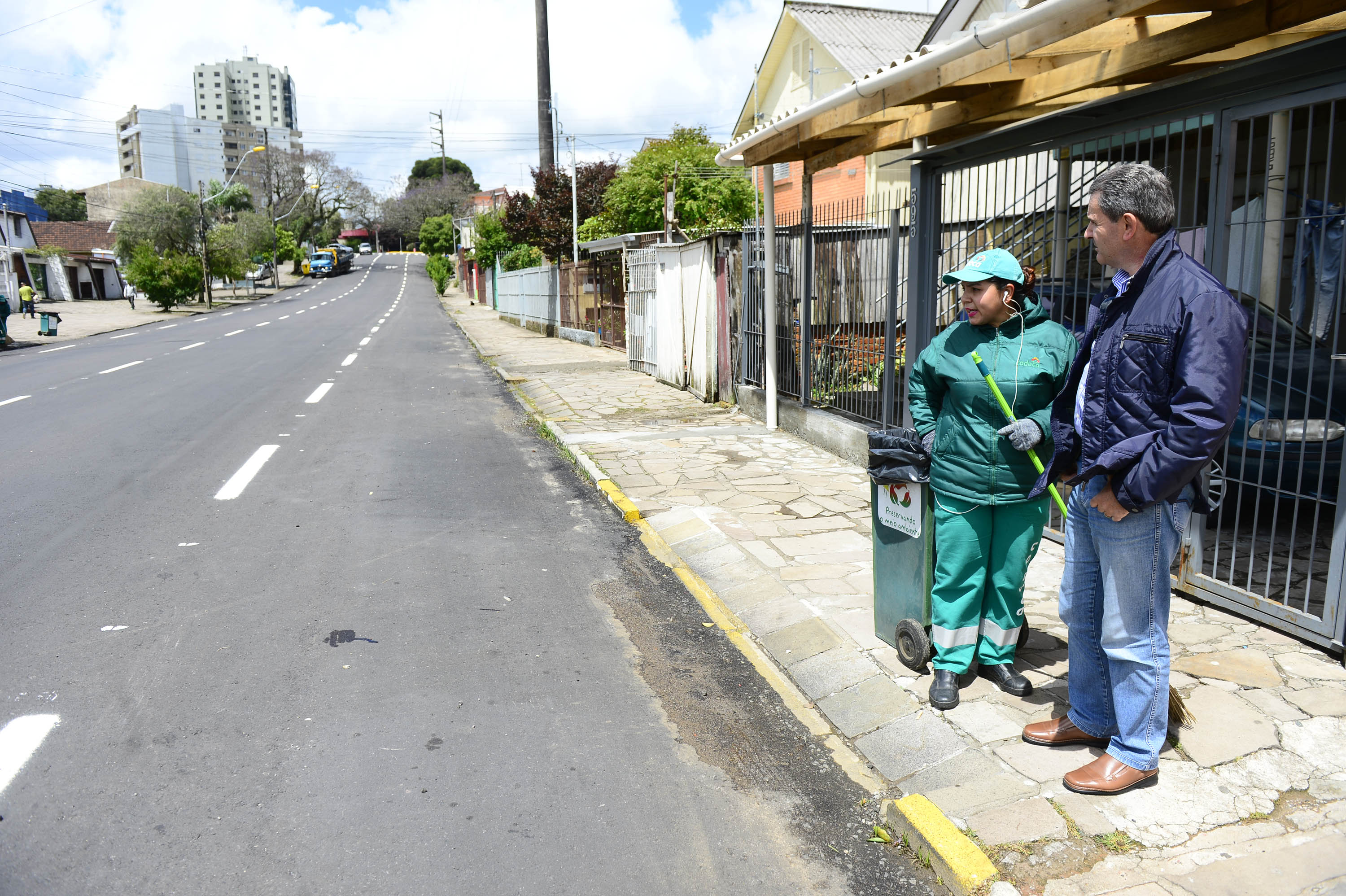 O Prefeito Alceu Barbosa Velho conferiu na tarde desta quinta-feira (27/10) a conclusão das obras nas ruas Irma Zago e Assis Brasil, no bairro Sagrada FamÃlia. As vias receberam pavimentação asfáltica, foram retirados dois canteiros e instalado um novo, com o objetivo de melhorar a circulação de pedestres e veÃculos. O investimento do MunicÃpio foi de R$ 530 mil. Alceu conversou com moradores e agradeceu aos colaboradores da CODECA, que realizou o serviço, que faziam a limpeza das calçadas no entorno. Fotos: Rafael Lopes