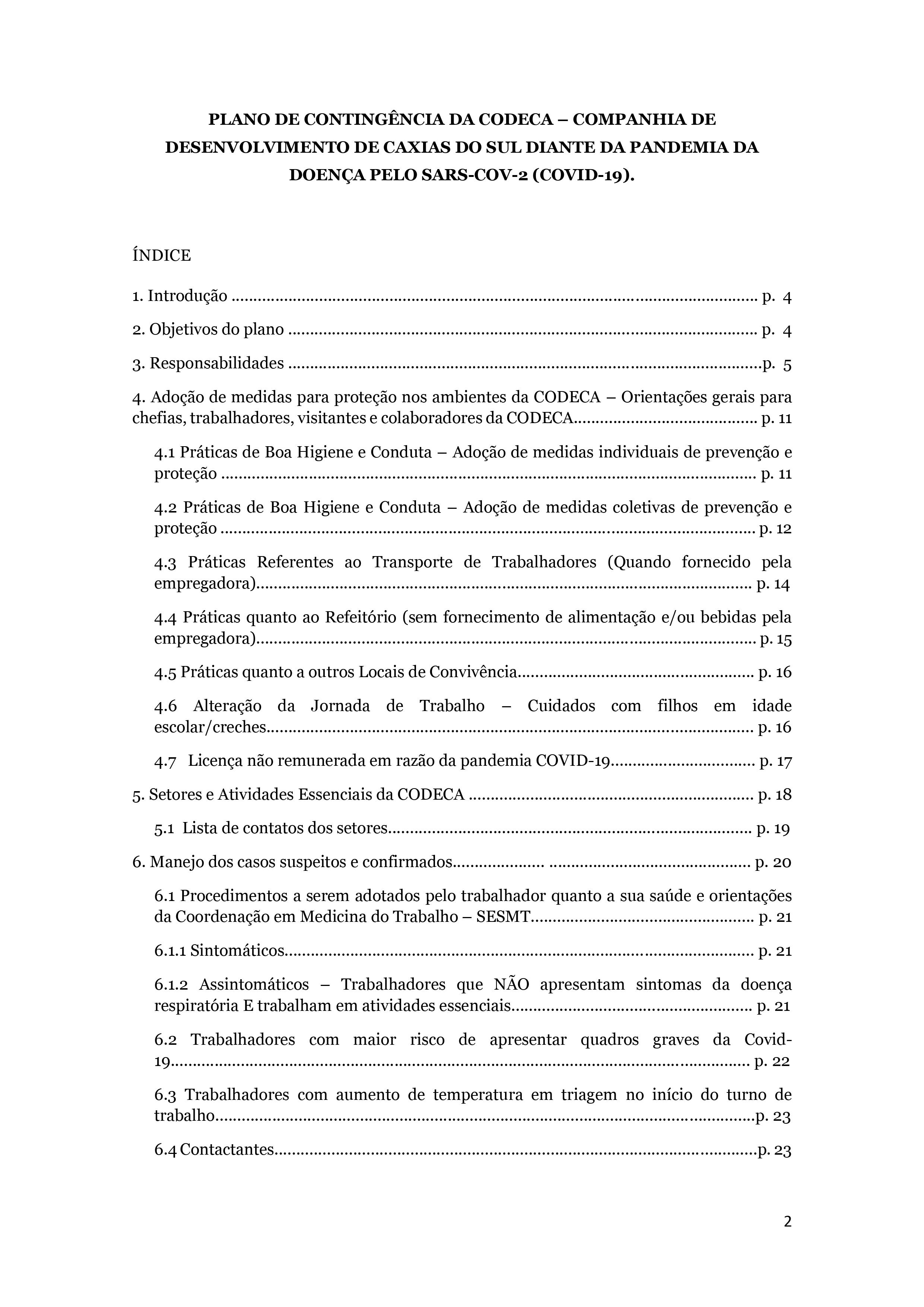 PLANO DE CONTINGÊNCIA DA CODECA DIANTE DA PANDEMIA DA DOENÇA PELO SARS-COV-2 (COVID-19). PLANO DE CONTINGÊNCIA DA CODECA – COMPANHIA DE DESENVOLVIMENTO DE CAXIAS DO SUL DIANTE DA PANDEMIA DA DOENÇA PELO SARS-COV-2 (COVID-19). ÍNDICE 1. Introdução ........................................................................................................................ p. 4 2. Objetivos do plano ........................................................................................................... p. 4 3. Responsabilidades ............................................................................................................p. 5 4. Adoção de medidas para proteção nos ambientes da CODECA – Orientações gerais para chefias, trabalhadores, visitantes e colaboradores da CODECA.......................................... p. 11 4.1 Práticas de Boa Higiene e Conduta – Adoção de medidas individuais de prevenção e proteção .......................................................................................................................... p. 11 4.2 Práticas de Boa Higiene e Conduta – Adoção de medidas coletivas de prevenção e proteção .......................................................................................................................... p. 12 4.3 Práticas Referentes ao Transporte de Trabalhadores (Quando fornecido pela empregadora)................................................................................................................. p. 14 4.4 Práticas quanto ao Refeitório (sem fornecimento de alimentação e/ou bebidas pela empregadora).................................................................................................................. p. 15 4.5 Práticas quanto a outros Locais de Convivência...................................................... p. 16 4.6 Alteração da Jornada de Trabalho – Cuidados com filhos em idade escolar/creches............................................................................................................... p. 16 4.7 Licença não remunerada em razão da pandemia COVID-19................................. p. 17 5. Setores e Atividades Essenciais da CODECA ................................................................. p. 18 5.1 Lista de contatos dos setores................................................................................... p. 19 6. Manejo dos casos suspeitos e confirmados..................... .............................................. p. 20 6.1 Procedimentos a serem adotados pelo trabalhador quanto a sua saúde e orientações da Coordenação em Medicina do Trabalho – SESMT................................................... p. 21 6.1.1 Sintomáticos........................................................................................................... p. 21 6.1.2 Assintomáticos – Trabalhadores que NÃO apresentam sintomas da doença respiratória E trabalham em atividades essenciais....................................................... p. 21 6.2 Trabalhadores com maior risco de apresentar quadros graves da Covid-19.................................................................................................................................... p. 22 6.3 Trabalhadores com aumento de temperatura em triagem no início do turno de trabalho...........................................................................................................................p. 23 6.4 Contactantes..............................................................................................................p. 23 6.5 Casos Confirmados – Trabalhadores com teste positivo para COVID- 19.....................................................................................................................................p. 24 6.6 Exames .....................................................................................................................p. 24 6.7 Notificação dos Casos................................................................................................p. 24 7. Suspensão de Exigências Administrativas em SST........................................................ p. 24 8. Referências...................................................................................................................... p. 25 9. Grupo de Trabalho (Portaria 006-2020)........................................................................ p. 26 ANEXOS I. PROTOCOLO CASOS SUSPEITOS OU CONFIRMADOS COVID-19.............................p. 27 II. PLANO DE AÇÕES PARA ENFRENTAMENTO DA PANDEMIA COVID-19 – Orientações para a gestão dos trabalhos nas áreas Administrativas e Operacionais............................p. 28 1) Ação para Desinfecção e Prevenção a COVID-19 na CODECA....................................p. 28 2) Portarias e Áreas de Recepção de Pessoas...................................................................p. 29 3) Administrativo..............................................................................................................p. 29 4) DLU – Coleta..................................................................................................................p. 31 5) DLU – Varrição..............................................................................................................p. 33 6) DLU – Capina................................................................................................................p. 35 7) DCC – DCC....................................................................................................................p. 36 8) DCC - CTR....................................................................................................................p. 38 9) DLU- TRANSBORDO....................................................................................................p. 39 10) PRESTADORES DE SERVIÇOS..................................................................................