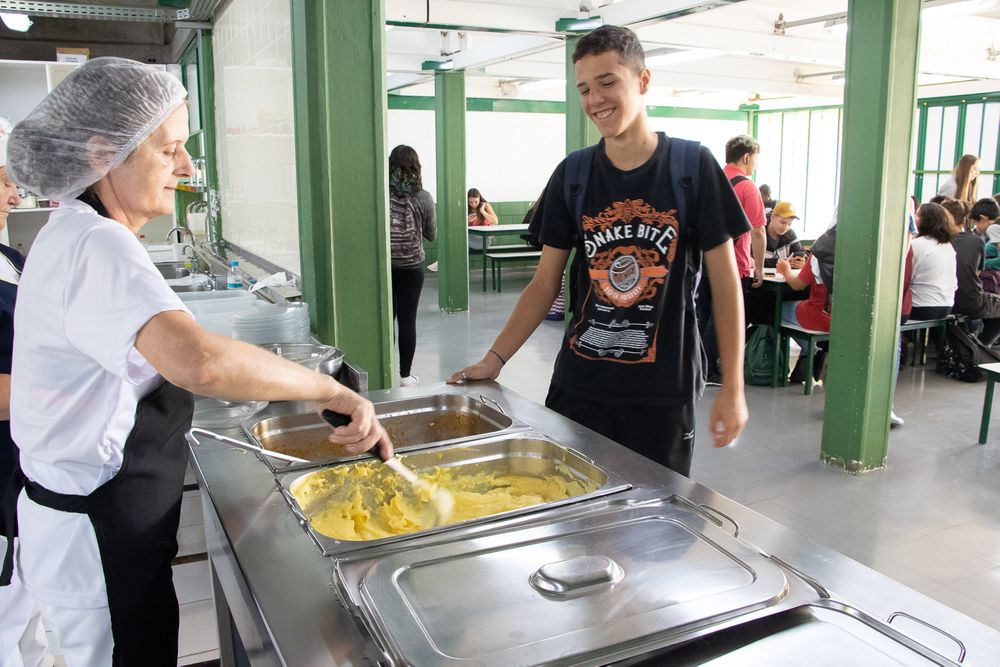 Um clássico da gastronomia afetiva foi o escolhido para a arrancada do programa Prato Saudável, que desde esta quarta-feira (1º/03) passa a servir duas refeições por turno a estudantes da rede municipal de Caxias do Sul. A imbatÃvel combinação de polenta cremosa com molho caseiro de frango foi saboreada no almoço pelas turmas de pré ao 9º ano do Ensino Fundamental, professores e funcionários das instituições. Com aproximadamente 700 estudantes e três turnos de atividade, a EMEF Dolaimes Stedile Angeli (CAIC) tem agora a cozinha funcionando, considerando o tempo de preparativos e limpeza, das 6h45 à s 19h50. No dia de estreia do novo programa de alimentação desenvolvido pela Prefeitura por meio da Secretaria Municipal de Educação (SMED), foram servidos café-da-manhã, dois almoços (sim, dois: um por volta de 11h30 e o outro, pelas 13h15), lanche e jantar. Equipe afinada na cozinha Pelo entrosamento na condução da sinfonia de panelas, pratos e talheres, parece que o conjunto se conhece há muito tempo. Mas a verdade é que o quarteto à frente da cozinha da EMEF Dolaimes Stédile Angeli é tão estreante como grupo quanto o programa Prato Saudável. Almeri Drum, Rosane Dewes, Rozane Fátima Soares e Terezinha Aparecida Batista Ribas estão se conhecendo neste inÃcio de ano letivo, enquanto formam a escala de trabalho no refeitório do CAIC. As quatro compõem o efetivo de quase 450 profissionais responsáveis pela merenda com que a Codeca atenderá a rede municipal de ensino em 2023. Para dar conta da nova demanda gerada pelo Prato Sustentável, oito novos postos de trabalho foram criados.