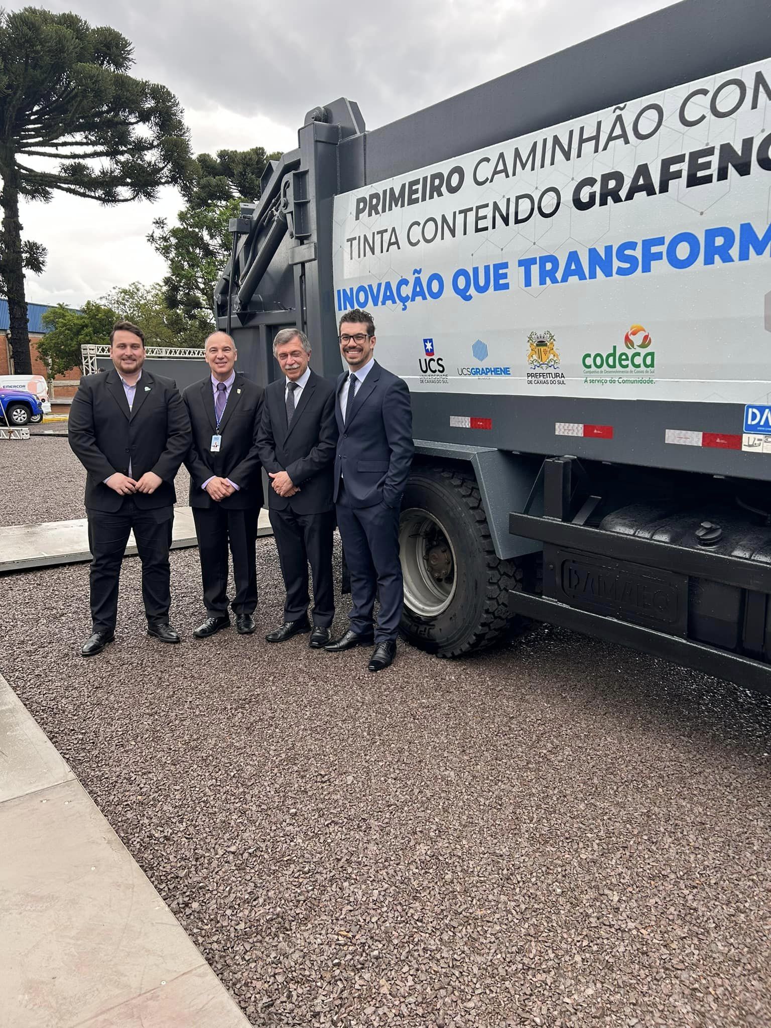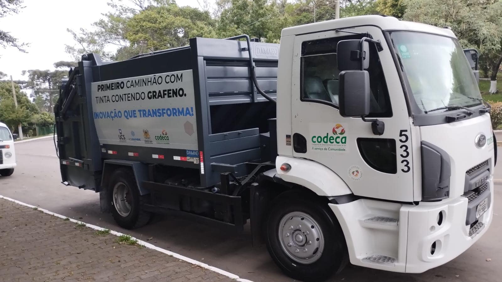 A comunidade pode conferir pelas ruas da cidade o primeiro caminhão do Brasil pintado com grafeno. O caminhão da Codeca, após ficar em exposição na 2ª Feira Brasileira do Grafeno, que aconteceu na UCS, volta para os trechos da coleta de resÃduos nos bairros. Na feira, o Prefeito Adiló Didomenico e o vice-reitor da UCS, Asdrubal Falavigna conferiram a pintura acompanhados pelo professor Diego Piazza, da UCS Graphene e do diretor administrativo financeiro da Codeca, Gabriel Ramos. A cor cinza vem da tinta contendo grafeno, material inovador, em uma parceira da Codeca com a UCS Graphene. O veÃculo foi pintado pela equipe da chapeação da Companhia com as tintas doadas pela UCS. Essa tecnologia prevê maior durabilidade da pintura, visto o veÃculo estar sempre exposto ao clima diariamente. A presidente da Codeca, Maria de Lourdes Fagherazzi destaca a importância da parceria com a UCS. “ Levando em consideração que a Codeca é uma empresa do municÃpio e que o municÃpio de Caxias do Sul também tem uma cadeira no conselho da Fundação Universidade de Caxias do Sul, entendemos como oportuna essa parceria de pintar um dos nossos caminhões com tinta contendo grafeno e aproveitando para fazer a divulgação da 2ª Feira Nacional do Grafeno. Além disso, essa atividade tem aderência com o nosso planejamento estratégico que prevê a inovação como forma de sustentabilidade da empresa\".