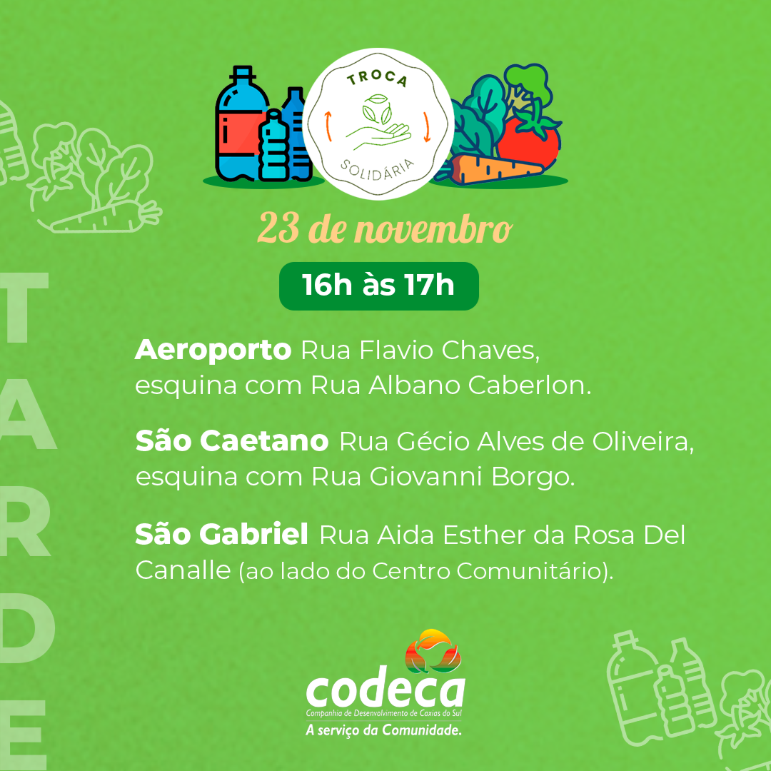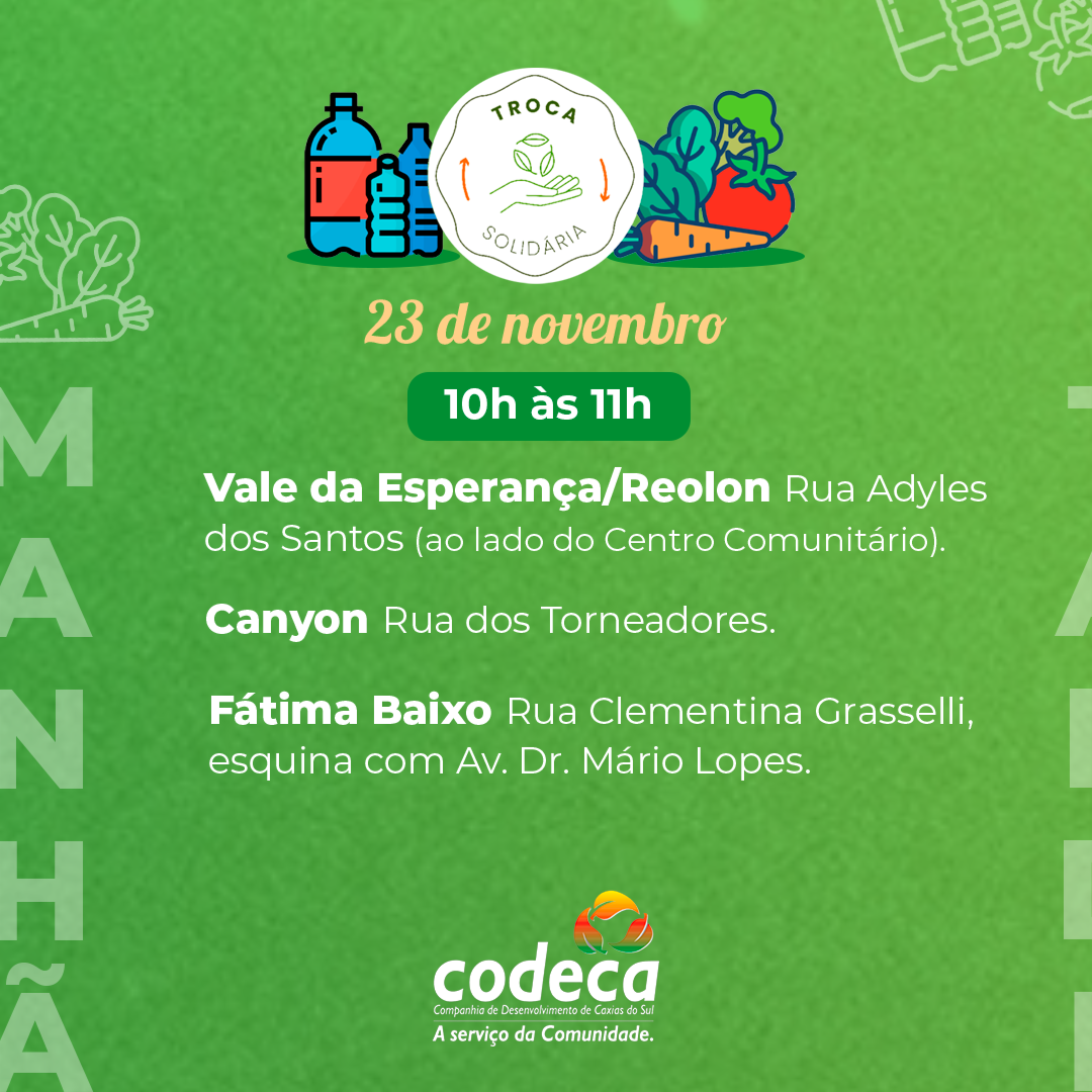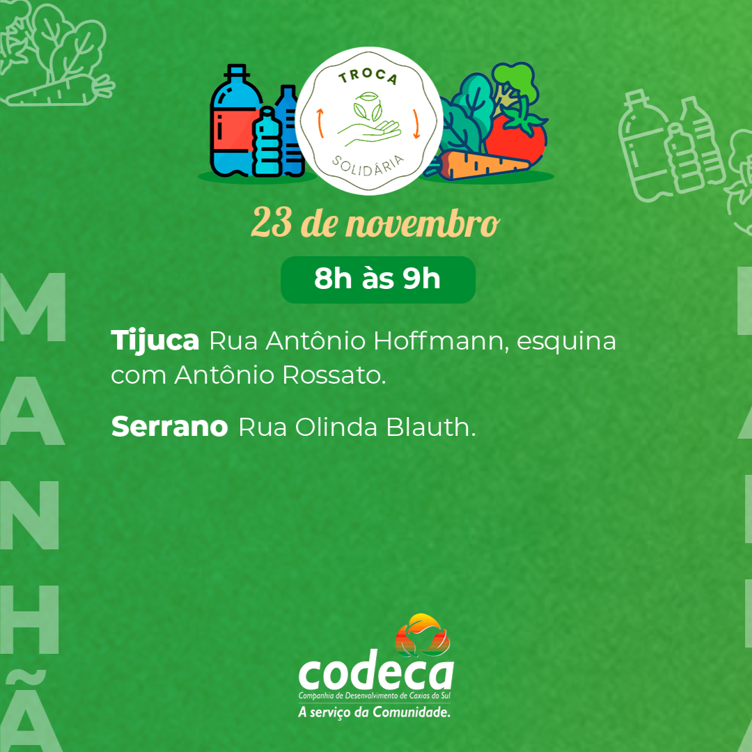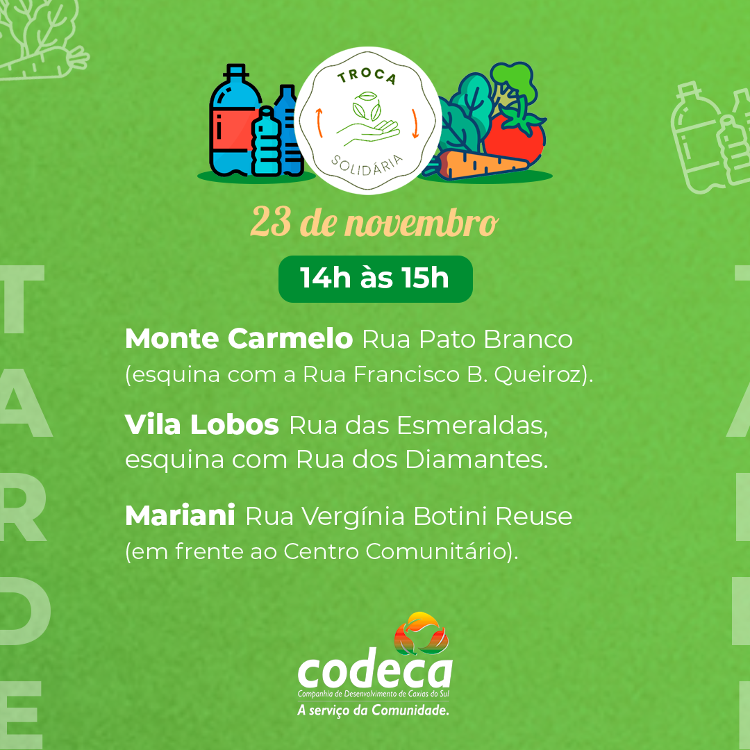 O Troca Solidária percorre 11 bairros de Caxias do Sul neste sábado (23/11). O programa, realizado semanalmente, propicia aos moradores trocar quatro quilos de resÃduos seletivos por um quilo de hortifrutigranjeiros de produtores locais. A ação, além de ajudar a cuidar da limpeza da cidade, oferece um complemento alimentar de qualidade e incentiva a agricultura familiar. Confira o roteiro desta semana: 8h à s 9h – Tijuca e Serrano 10h à s 11h – Vale da Esperança/Reolon, Canyon e Fátima Baixo 14h à s 15h – Monte Carmelo, Vila Lobos e Mariani 16h à s 17h – Aeroporto, São Caetano e São Gabriel Saiba mais sobre o programa - O Troca Solidária é uma iniciativa do municÃpio, operacionalizada pela Codeca em parceria com a Secretaria da Agricultura, Pecuária e Abastecimento (Smapa) e a Fundação de Assistência Social (FAS). - Implantado em 20 de junho de 2009, o programa foi retomado em 2021, depois de uma pausa de dois anos. - Atualmente, acontece aos sábados e beneficia 27 bairros/loteamentos. - Em 2023, o Troca Solidária recebeu o 5º Prêmio Boas Práticas de Gestão Pública, promovido pela Federação das Associações de MunicÃpios do Rio Grande do Sul (Famurs). - Em 2022, foram trocados 793 mil quilos de resÃduos por 200 mil quilos de hortifrutigranjeiros. Em comparação a 2021, o programa superou em mais de 200% a troca de resÃduos por mantimentos (240 mil quilos de resÃduos por 61 mil quilos de alimentos). - Novo recorde foi batido em 2023 quando a comunidade trocou 921.400 quilos de resÃduos por 234.350 quilos de frutas e verduras. - *Em 2024*, já foram recolhidos *861.062 quilos de resÃduos* e *distribuÃdos 215.903 quilos de alimentos*. - A ação visa, também, proporcionar aos agricultores da Serra Gaúcha a comercialização de seus produtos e, por sua vez, as associações de recicladores conveniadas com o municÃpio recebem os resÃduos seletivos. - Todos saem ganhando: o meio ambiente, as famÃlias, as associações de recicladores e os agricultores locais.