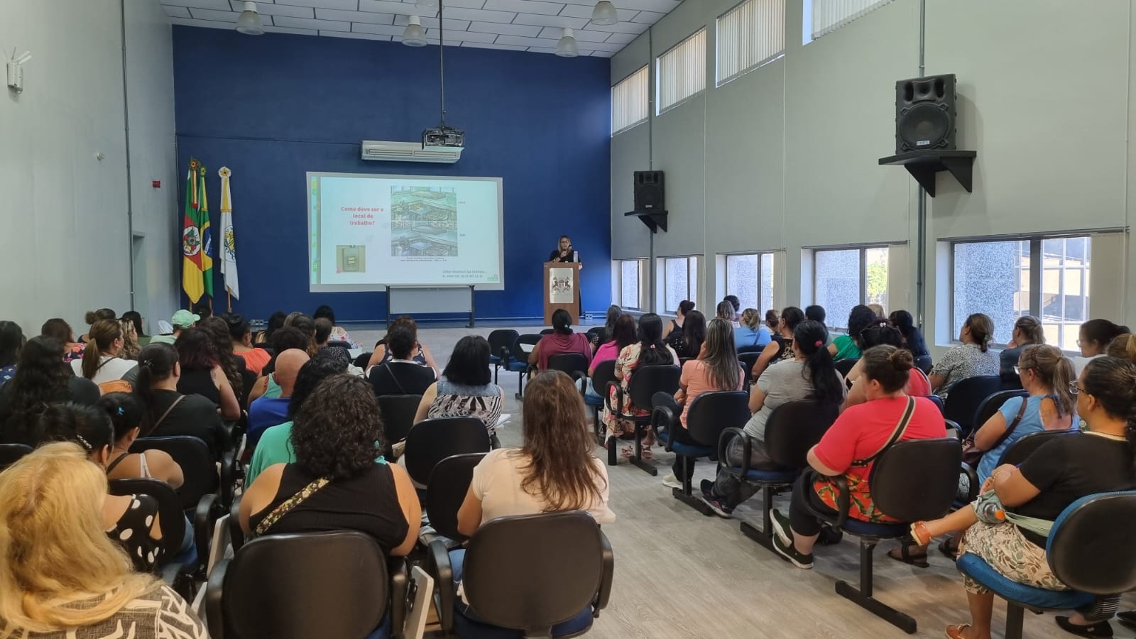 A equipe da Codeca responsável pelas refeições da rede municipal de ensino participa nesta quarta (5) e sexta-feira (7) da Capacitação em Boas Práticas para Serviços de Alimentação. O curso é obrigatório e serve de preparação para a volta às aulas. A Codeca produz a merenda de 80 escolas municipais e três pontos de apoio da Secretaria Municipal de Educação (Smed). São mais de 40 mil refeições servidas por dia. Divididas em duas turmas, as merendeiras assistem a palestras da nutricionista Francine Malicheski, da Codeca, e da psicóloga Débora Bueno, além de receberem orientações de nutricionistas do setor da alimentação escolar da Smed. A diretora-presidente da Codeca, Maria de Lourdes Fagherazzi, e os diretores Administrativo-Financeiro, Gabriel Ramos Ribeiro, e de Operações, Angelo Barcarolo, participaram da abertura do evento, no auditório do Centro Administrativo Municipal.