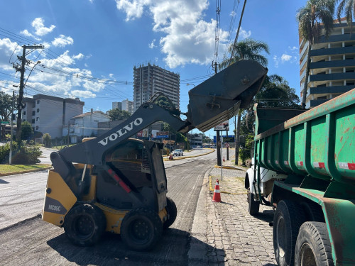 Rua Ludovico Cavinato tem bloqueio de trânsito para recuperação do pavimento pela Codeca