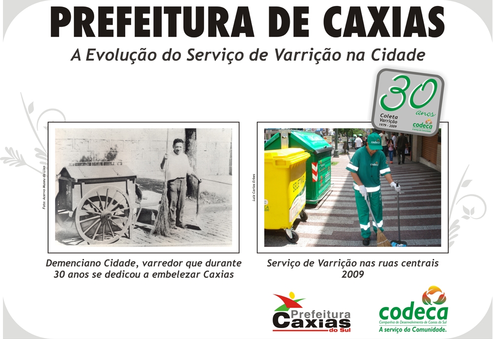 A Companhia de Desenvolvimento de Caxias do Sul (CODECA) comemora nesta segunda-feira (15/06) os 30 anos dos Serviços de Coleta e Varrição, a partir das 10h, em solenidade no Salão Nobre da Prefeitura. E já planejando os próximos 30 anos, a CODECA aproveitará para anunciar detalhes da reestruturação da coleta orgânica (com novos roteiros) e da ampliação da coleta seletiva. Ambos serviços terão alterações no segundo semestre, envolvendo todos os bairros de Caxias. Segundo o Diretor Presidente da Companhia, Adiló Didomenico, as mudanças são necessárias para acompanhar o crescimento da cidade. “Será implantada uma nova sistemática de coleta orgânica por área de atuação, trazendo mais eficiência e agilidade ao serviço”, explica. Ele ressalta que a CODECA terá quatro caminhões novos somados à frota atual. Mudará também a coleta seletiva, que terá freqüência maior em vários bairros. “Assim como aconteceu no início do sistema de contêineres, vamos precisar da colaboração da comunidade com relação à mudança nos horários e dias da coleta, pois as alterações vão abranger 80% da área urbana e mais da metade da população”, acrescenta Didomenico. De acordo com ele, a ampliação da coleta seletiva de uma para duas vezes por semana é reivindicada há tempos pela comunidade. TRINTA ANOS – A CODECA foi fundada oficialmente em 1975 e assumiu os serviços de coleta e varrição em 1979. Antes, ambos eram prestados por uma empresa privada com sede em São Paulo. Ao comemorar os trinta anos da coleta e da varrição, a CODECA irá homenagear os colaboradores com maior tempo de atuação, além de ex-diretores e do ex-prefeito Mansueto Serafini Filho. Para marcar a data, foram produzidos banners com fotos do acervo do Museu do Lixo e do Arquivo Histórico Municipal João Spadari Adami (em anexo). As imagens mostram a evolução dos serviços de coleta e varrição, com destaque para o antigo vazadouro São Virgílio (onde o lixo era jogado diretamente na natureza, sem qualquer tipo de tratamento). O material será apresentado na Prefeitura nesta segunda-feira. Depois, seguirá em exposição itinerante por escolas e demais instituições da comunidade.Depto. De Comunicação e Marketing CODECA12.06.2009