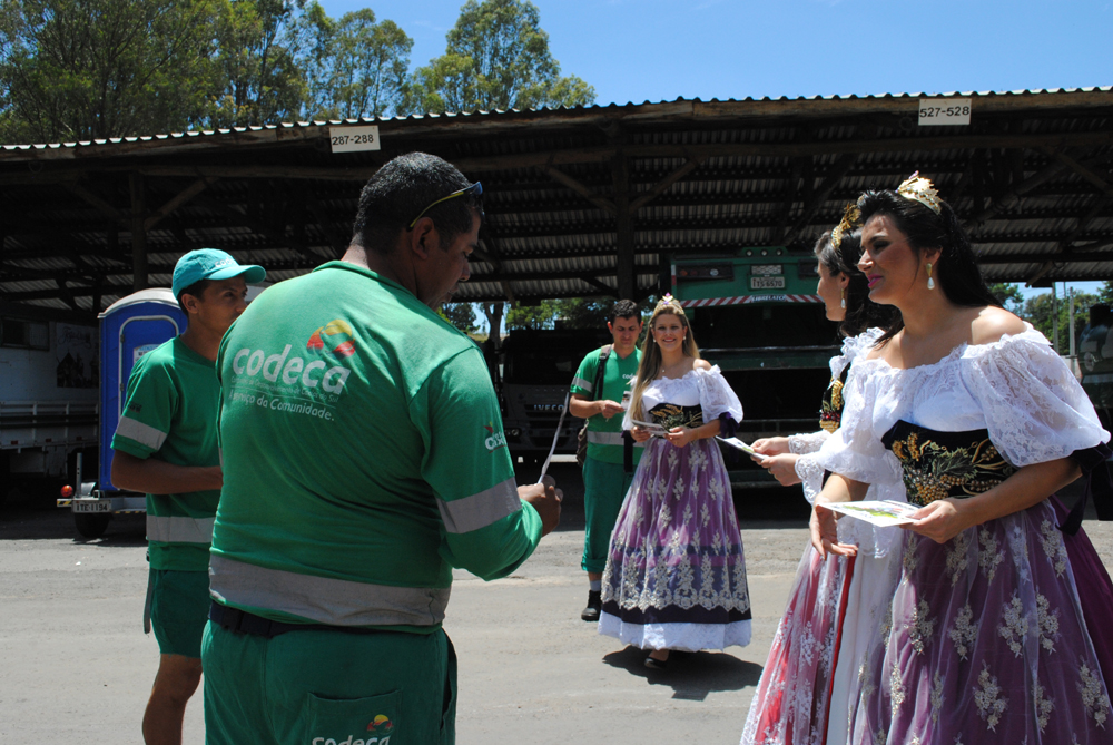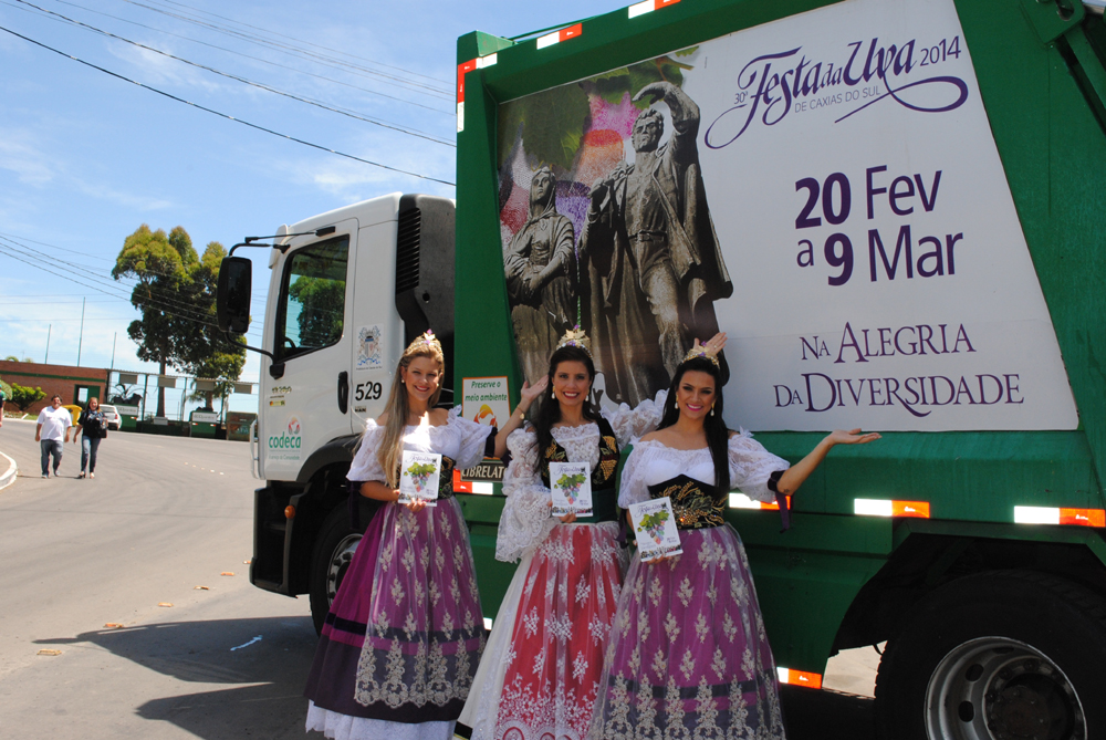 O almoço dos funcionários da Codeca, nesta quinta-feira (19/12),contou com a presença da rainha da Festa Nacional da Uva, Giovana Dannenhauer Crosa e das Princesas Gabrielle Debastiani e Karina Furlin. Elas aproveitaram o horário do meio dia para convidar os funcionários para a 30ª Festa, que acontece de 20 de fevereiro a 9 de março, nos Pavilhões da Festa da Uva, em Caxias do Sul. A rainha e as princesas distribuíram fôlderes e destacaram a importância da festa à comunidade. Recepcionadas pelo Diretor-Presidente, Valter AugustoWebber e pelo Diretor-Administrativo Financeiro da Companhia, MiltonLuiz Balbinot, as soberanas permaneceram na Codeca até às 13h30min.Em clima festivo, nos meses em que antecede a Festa da Uva, a comunidade pode visualizar o slogan, “Na Alegria da Diversidade”, juntamente com a data do evento, nos caminhões da coleta seletiva e orgânica que circulam diariamente pelas ruas da cidade. Ainiciativa, uma parceria da Festa da Uva e Codeca, tem como objetivointensificar a divulgação, bem como proporcionar à populaçãoimagens que retratam a beleza e a grandeza da Festa.O Diretor Presidente da Codeca, Valter Augusto Webber, ressalta que a Festa Nacional da Uva recebe uma valorização especial por parte dadiretoria bem como de todos os funcionários da Companhia. “Afamília Codeca valoriza e está no espírito da Festa. Queremos quea comunidade entre também no clima. Os caminhões da Codeca, sejameles da coleta, capina ou varrição, circulam por todos os bairros,ruas da cidade. São verdadeiros outdoors ambulantes. Somos umaempresa da comunidade e estamos orgulhos em poder aliar a execução do serviço essencial à divulgação da cultura de um povo que faz história em Caxias do Sul”, frisa Valter.