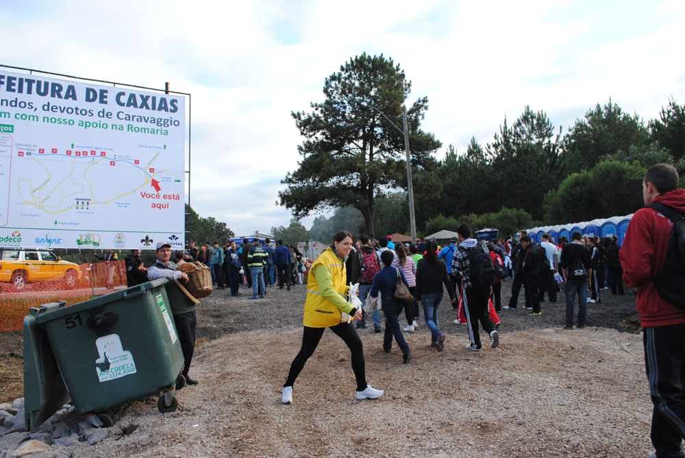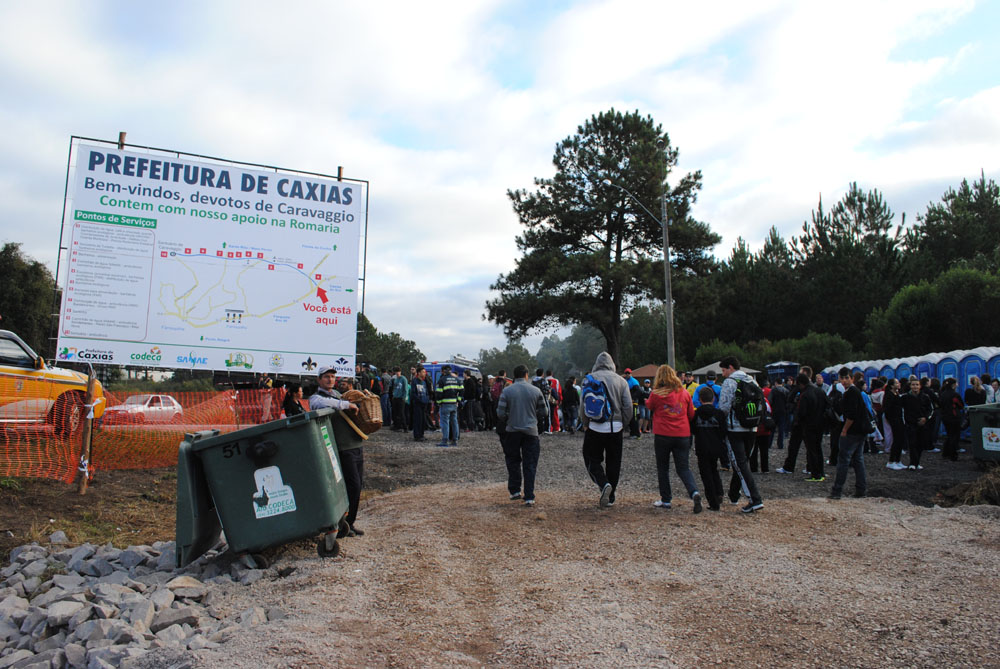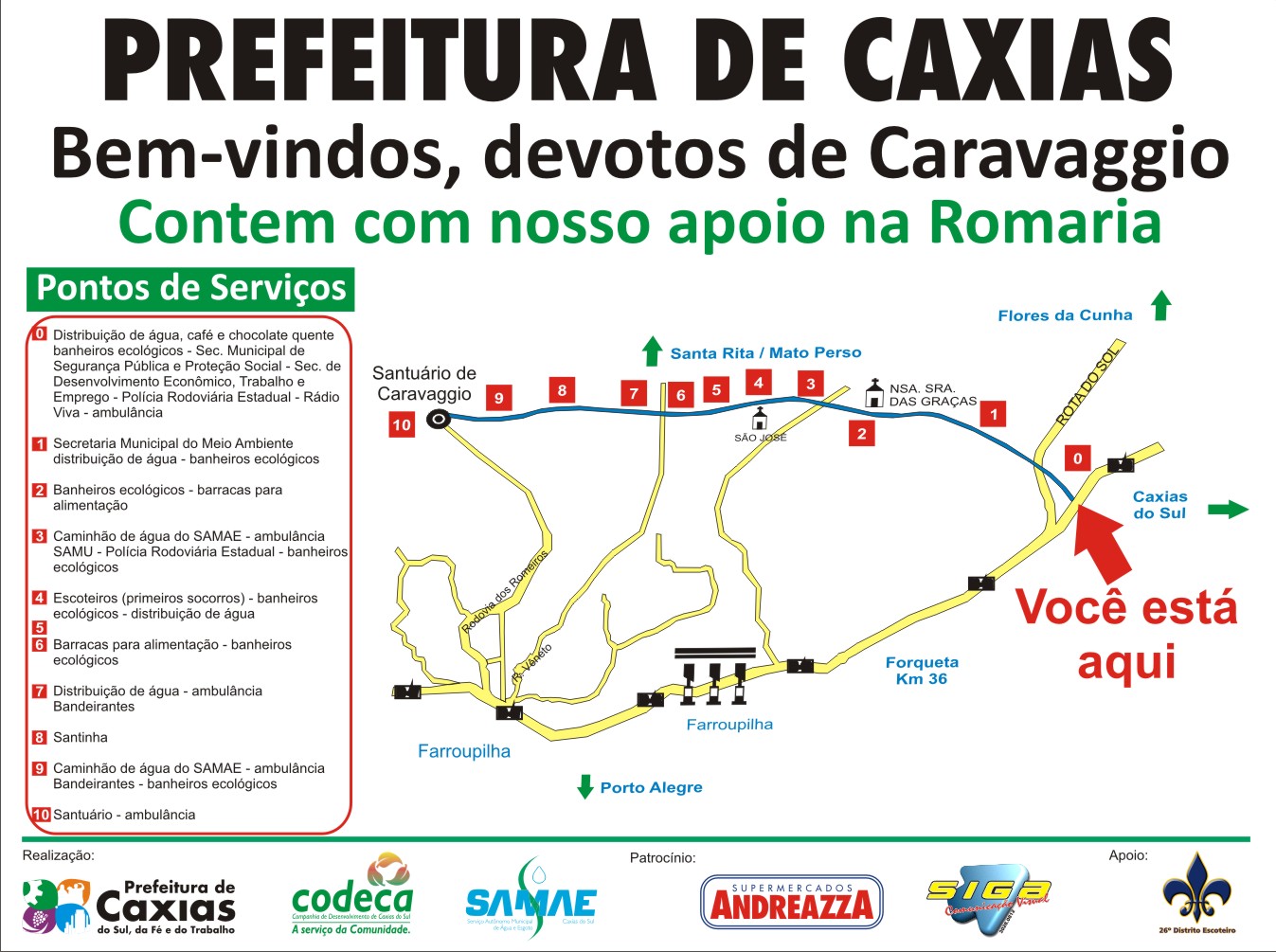 Cerca de 280 pessoas trabalharão nos pontos de apoio ao longo do percurso. Número que representa a união de esforços de setores da administração municipal e entidades privadas focadas em oferecer exclusivamente uma infraestrutura especial aos romeiros, que durante três dias evidenciam a fé e a religiosidade um de um povo que luta, trabalha e cresce, imbuídos nesses valores que se sustentam ao longo desses 135 anos de Romaria. CODECA: Vai disponibilizar 200 tonéis de duzentos litros cada e 32 contêineres de um metro cúbicos ao longo do percurso, com posterior coleta e limpeza de vias durante os três dias. As equipes da Companhia que vão trabalhar no trajeto solicitam que os romeiros colaborem com a limpeza e utilizem os recipientes para depositar os resíduos. Além disso, serão distribuídas 30 mil sacolas recicláveis para acondicionar o lixo. Segurança Pública e Proteção Social: A Guarda Municipal estará atuando com motos e viaturas a partir do ponto zero até o ponto três. Haverá orientação aos romeiros no Viaduto Campo dos Bugres. Também prestará apoio aos Agentes de Trânsito. A Coordenadoria da Juventude auxiliará a Polícia Rodoviária Estadual na travessia dos romeiros, na RSC 453, com sinalização por meio de de lanternas de identificação e coletes refletivos. “Bretes” proporcionarão maior segurança aos romeiros na travessia da rodovia. Secretaria da Saúde: Serão disponibilizadas duas ambulâncias junto aos pontos 3 e 7. O auxílio aos romeiros no decorrer do percurso, foi pré-identificado e mapeado através de 11 pontos específicos, onde as equipes farão o atendimento necessário: Ponto 1 (a 9,2 km do Santuário): Secretaria Municipal do Meio Ambiente fará a distribuição de água do Samae e terá banheiros ecológicos Ponto 3 (a 5,9 km do Santuário): Caminhão do Samae na distribuição de água e ambulância da Secretaria Municipal de Saúde e banheiros ecológicos Ponto 5 (a 3,2 km do Santuário): Ponto 7 (a 1,9 km do Santuário): Distribuição de água do Samae, ambulância da Secretaria Municipal da Saúde e o apoio das Bandeirantes Não será permitida a permanência de ambulantes sem devida autorização.